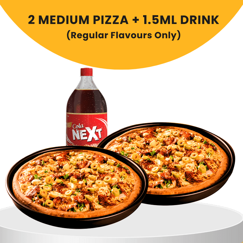- 2 Medium Pizzas: Choose from a variety of delicious regular flavors, crafted with fresh ingredients and topped with gooey cheese.